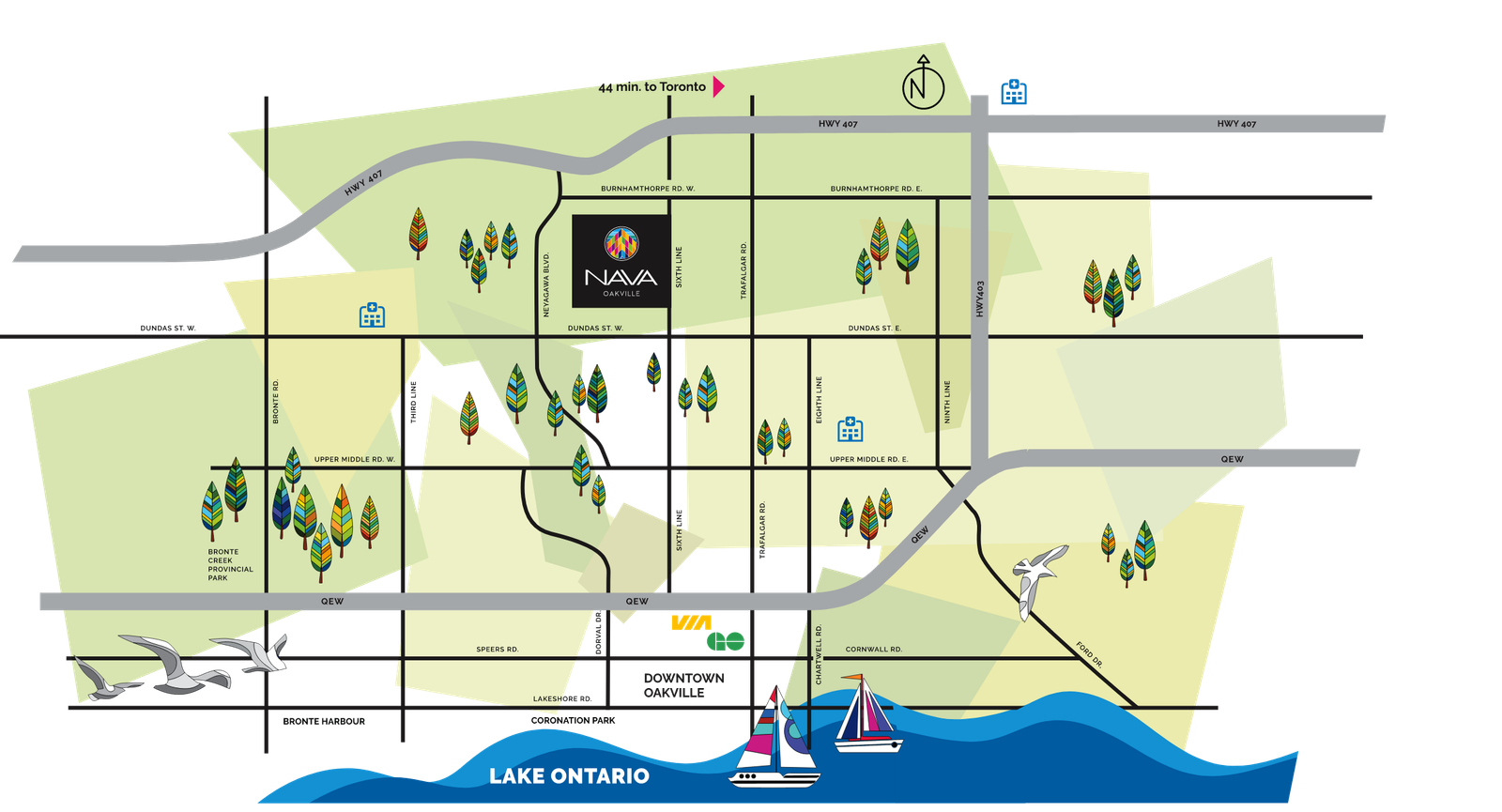 NAVA Oakville is ideally located in North Oakville, within the prestigious Glen Abbey Encore community. This prime location offers residents easy access to a wide range of amenities and attractions: