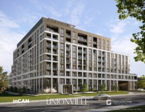 The Unionville features a distinctive white aluminum grid facade that defines its exterior. This striking element roots the building in Markham’s prestigious community, making it a modern landmark.