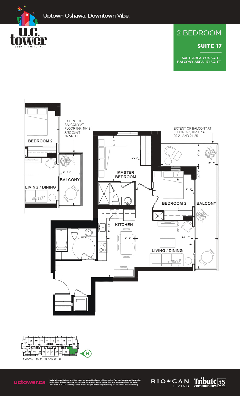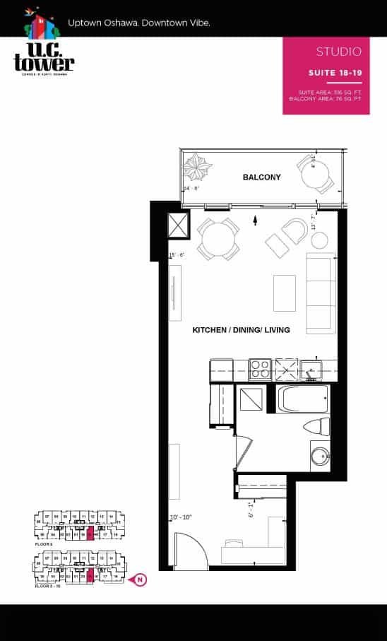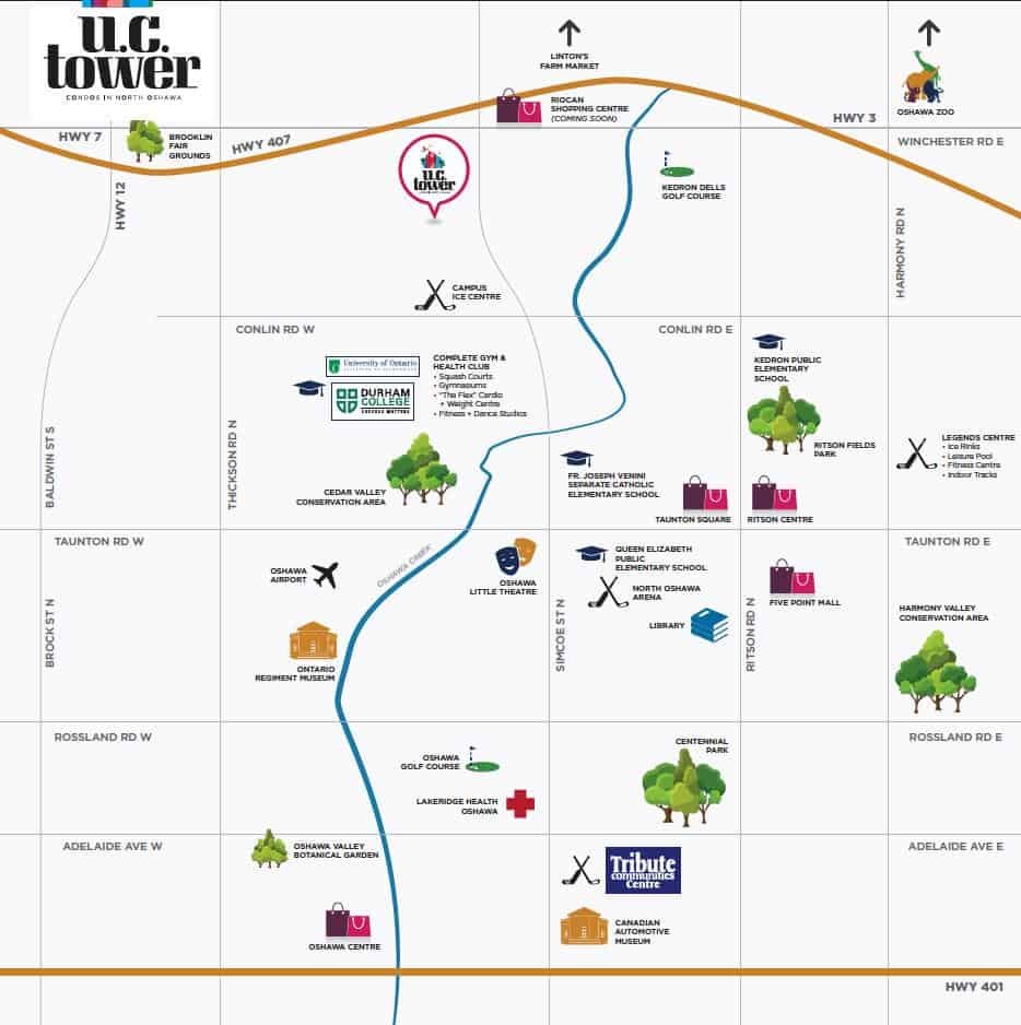 U.C. Tower Condominiums is a new high-rise condo development by Tribute Communities. Prices estimated to be starting from $354,490 to $469,990 and will feature 25 storeys. U.C. Tower Condominiums will have easy access to HWY 407, HWY 412 and HWY 401. U.C. Tower Condominiums is less than 18 minutes away from Oshawa GO Station, taking you to Union Station in Downtown Toronto in 1 Hour. The development estimated to be completed in 2022 and will be located on U.C. Community | Simcoe Street North & Winchester Road East at the Windfields neighbourhood in Oshawa.